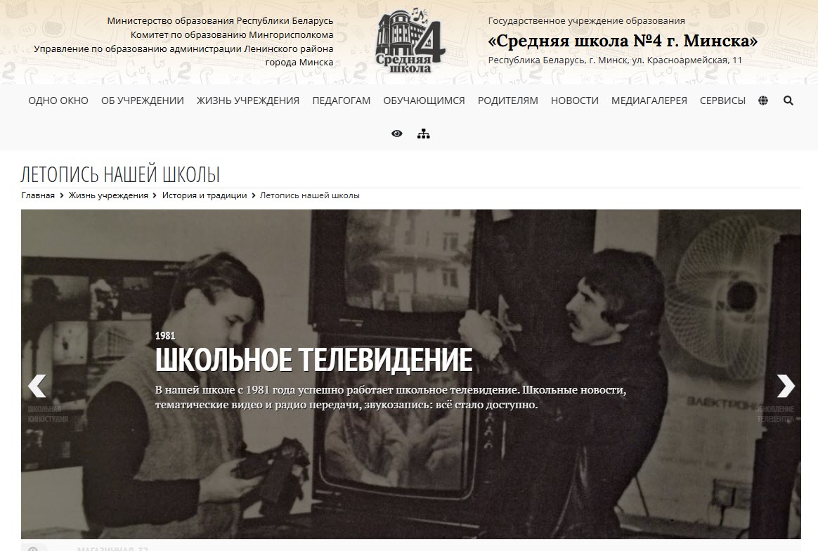 1981 — одно из первых упоминаний школьного телевидения в Минске — В летописи Средней школы №4 отмечено, что «с 1981 года успешно работает школьное телевидение». Это прямое свидетельство, что практики школьного видеопроизводства существовали уже в начале 1980-х.
