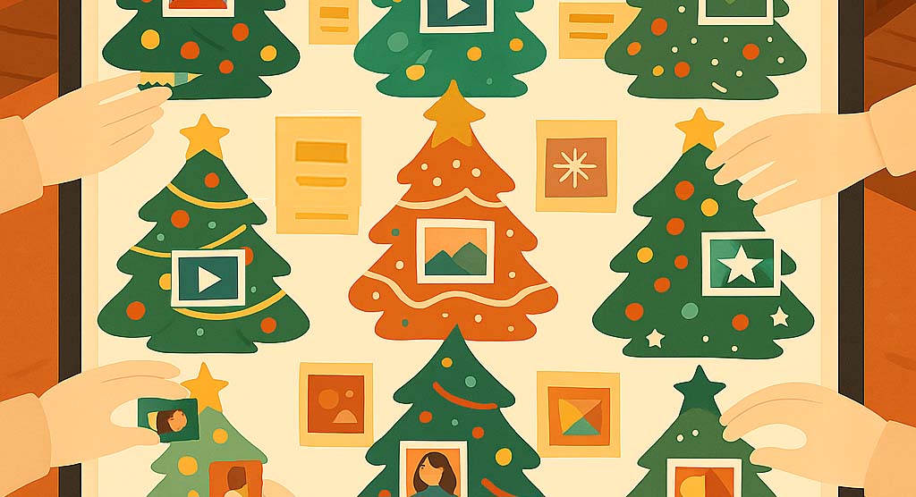 Представьте себе большую онлайн-доску в Canva. Теперь представьте, что на ней — целый лес новогодних елок. И одна из этих елок — елка вашего медиацентра!