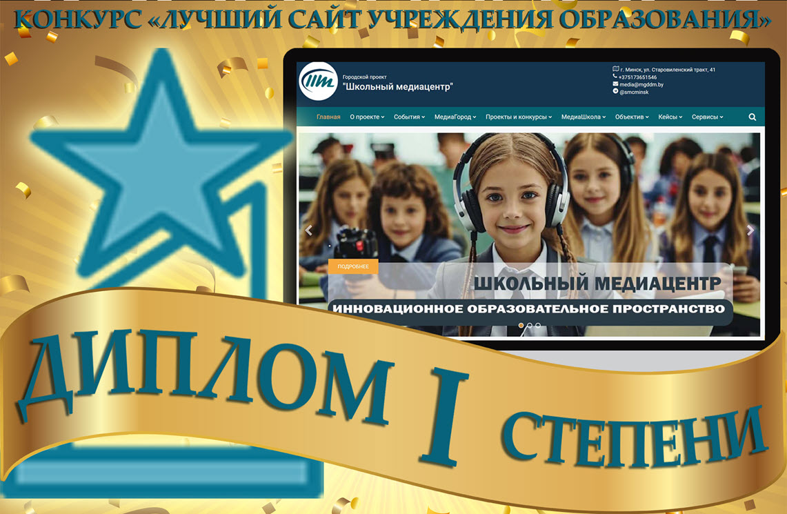 Сайт «Школьный медиацентр» УО «Минский государственный дворец детей и молодежи» в конкурсе «Лучший сайт учреждения образования» в номинации «Лучший тематический сайт» удостоен Диплома I степени. 🏆
